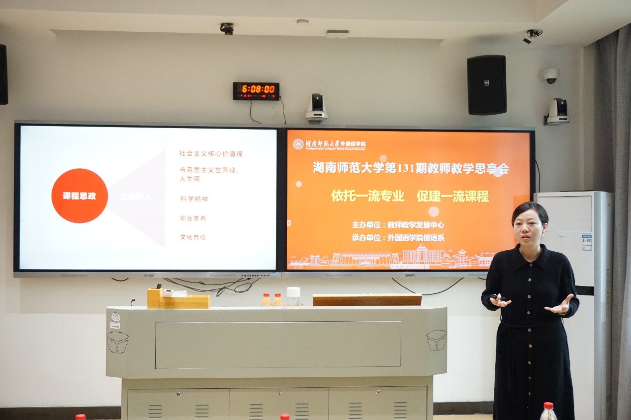 颜志科副教授介绍了湖南省一流线下本科课程、湖南省课程思政建设项目《高级俄语(一)》的课程建设历程、教学改革创新点、教学设计理念与教学方法、思政元素与语言教学的融合以及该课程的持续建设计划。颜志科副教授认为,课程思政的点是课程内容的组成部分,要由教学内容而发,需要与学生的生活经验、成长过程建立逻辑关系,并且学生能自然接受。课程思政不仅能有效激励学生产生学习内动力,而且能帮助教师提升自我、构建良好的教学关系。线下课程也要利用线上教学平台打造智慧学习空间,承载更多信息,延展线下课堂。课堂是教学的主战场,线下课程的建设具有重要意义。