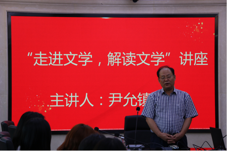 尹允镇教授以“学界对文学的定义”为导入,介绍了古今中外的大家对文学的理解与定义,提出了“文学是人在主客体关系中,借用想象、形象、语言表现主体愿望和要求的创美活动”的观点,并且从“文学是人类的主体活动、文学产生于主客体间的关系、文学是想象的产物、文学是形象的表现、文学是语言的艺术、文学反映了人类的主体愿望和要求、文学是人类创造美的活动、文学的表现与再现、文学是人类的创造性活动”等九个方面阐释了自身对于文学的理解与认识。