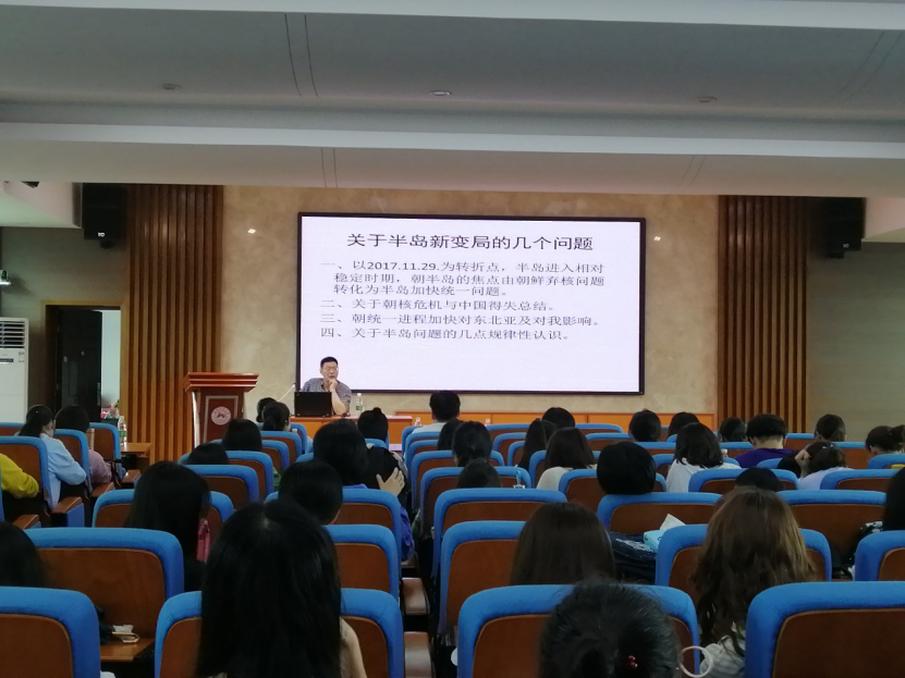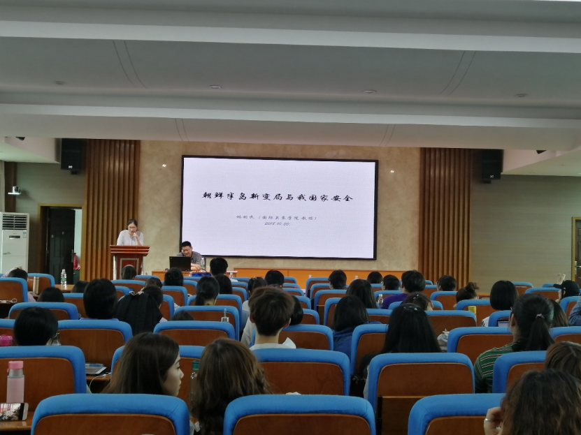林教授从四个方面提出了关于半岛新变局的几个问题。第一、以2019年11月29日为转折点,半岛进入相对稳定时期,朝半岛的焦点由朝鲜弃核问题转化为半岛加快统一问题;第二、关于朝核危机与中国得失总结;第三、朝统一进程加快对东北亚及对我国影响;第四、关于半岛问题的几点规律性认识。在场的同学们都听得津津有味,并表现出浓厚的兴趣。并且对朝鲜半岛有了更加深刻的了解和认知,同时对国际关系有了更加深刻的思考,为以后的学习和生活奠定了坚实的基础。在提问环节,同学们也是积极举手回答提问,林教授耐心回答同学们的提问。