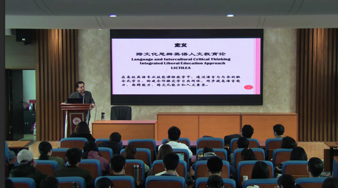 教授首先简要介绍了在高校英语专业技能课程教学中,通过语言与内容的融合式学习,构建合作探究学习共同体,同步提高语言能力、思辨能力、跨文化能力和人文素养。并详细阐释了教学范式基于三项基本教学原则:其一,语言课程是英语人文教育的必要组成部分;其二,语言能力包含思辨能力和跨文化能力;其三,语言学习是一个合作参与的社会文化建构过程。最后,孙教授反复强调英语专业技能课程教学应破除三大迷信:语言教学与知识教学相矛盾;语言教学与跨文化思辨教学相矛盾;语言教学必须专注于语言本身。