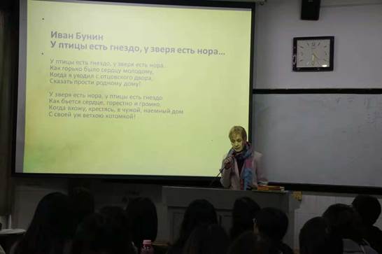 米哈伊洛娃教授介绍道,伊凡·布宁是诺贝尔文学奖获得者,成名于诗歌创作,主要成就体现在散文与小说创作。布宁是俄语语言大师,其作品的语言充满韵律感与音乐感。本次讲座以布宁的《鸟有巢来兽有穴……》(У птицы есть гнездо, у зверя есть нора…)这首诗开场,概括了布宁的一生:年轻时离开家乡的痛苦、侨居海外身处异乡的孤独,以布宁的生平经历和文学创作为线索,介绍了布宁在波尔塔瓦、敖德萨、彼得堡、莫斯科等地生活期间,远东之旅、侨居法国巴黎后的文学创作情况,分析了各个人生阶段对布宁文学创作的影响,并对《安东诺夫卡苹果》《乡村》《弟兄们》《轻盈的呼吸》《旧金山来的先生》《阿尔谢尼耶夫的生活》《幽暗的乡间小径》《托尔斯泰的解脱》等作品内容进行了深度解读。