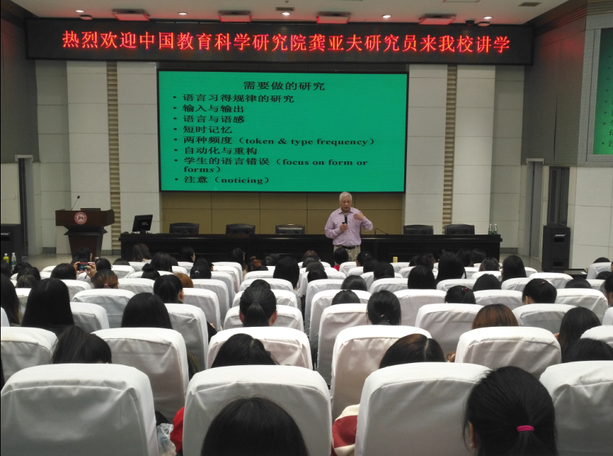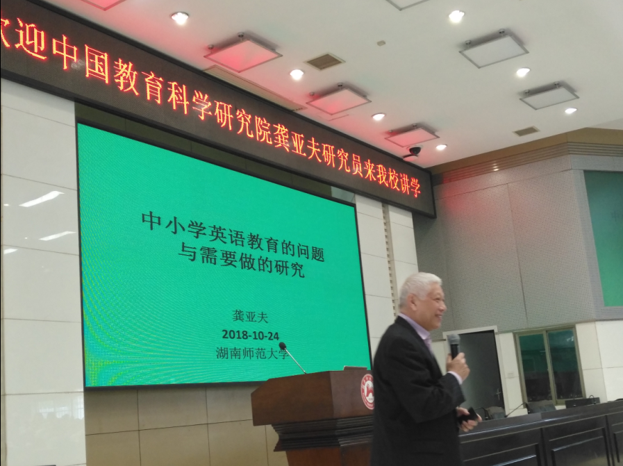 (通讯员李洪坤)10月24日上午,中国教育学会外语教学专业委员理事长龚亚夫研究员应邀到我校至善大讲堂作“中小学英语教育的问题与需要做的研究”的学术讲座。太阳成集团tyc33455cc官网副院长廖光蓉教授担任主持人,英语系学科英语教研室全体老师,长沙市岳麓区小学英语黄梦娟教研员率该区60多位小学英语老师出席了这次讲座。聆听这次讲座的还有太阳成集团tyc33455cc官网本科生、研究生等共计近300人。