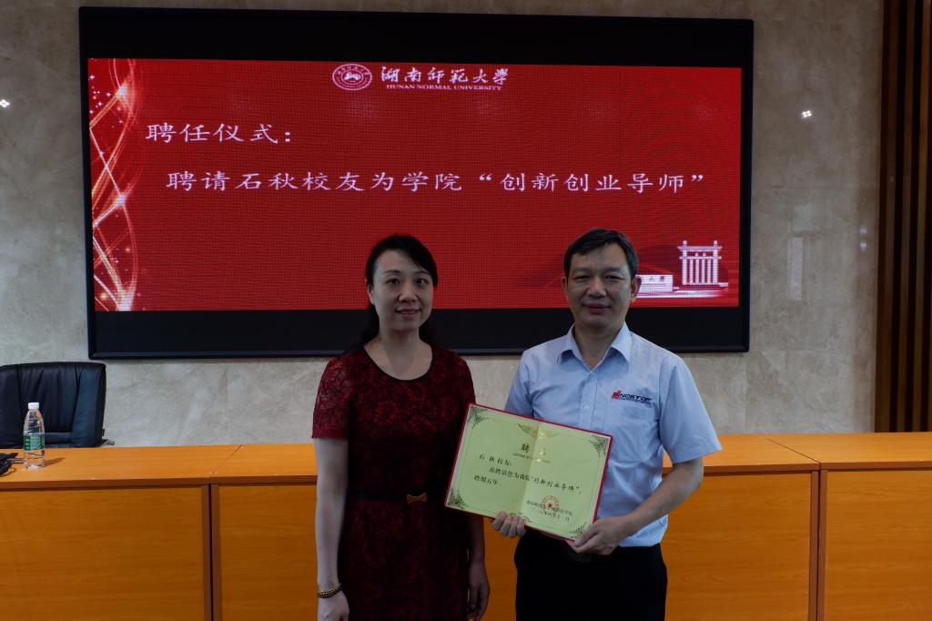 活动分两个阶段,第一阶段,学院聘任石秋校友为学生“创新创业导师”。贺慧星副书记介绍了石秋校友在创新创业方面取得的成就,余英书记代表学院向石秋校友颁发聘书。