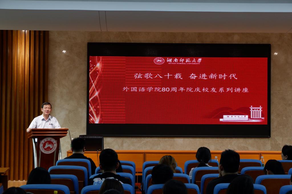 (通讯员张元强武泽文)6月11日下午,515报告厅举办“弦歌八十载,奋进新时代”80周年院庆校友系列讲座。拓集团董事长、我校广东江门校友会会长、太阳成官网94届英语系校友石秋带来《漫谈英语学习》的主题讲座。活动由学院党委贺慧星副书记主持,学生工作部向发意部长,学院党委余英书记,学工办张元强老师参加活动。