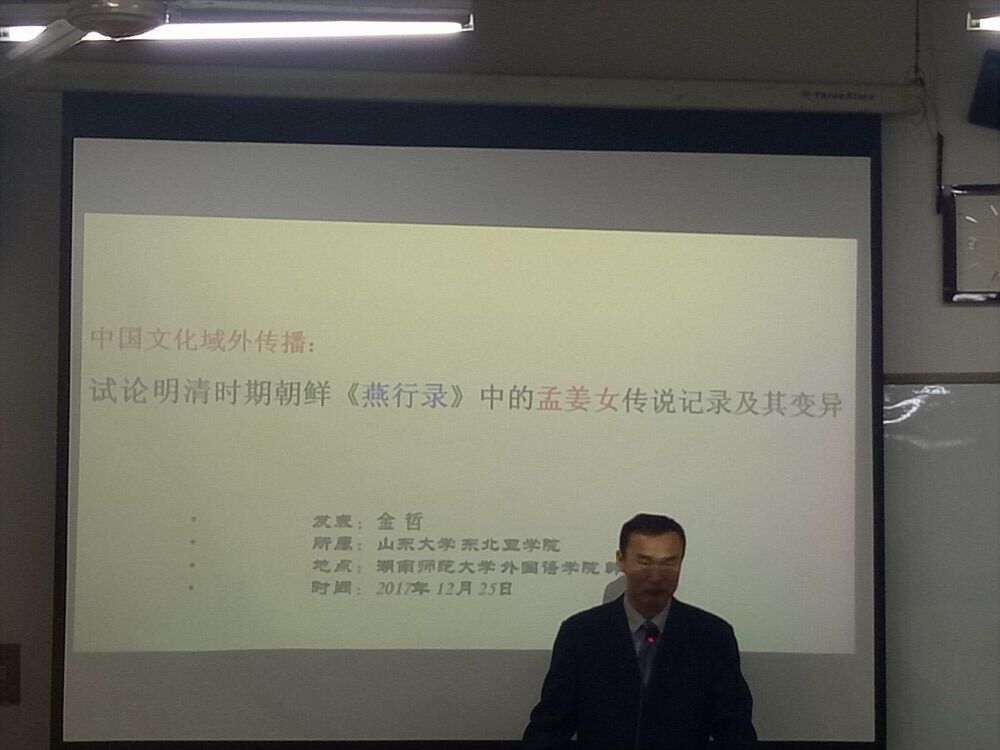 (通讯员 刘宏达)12月25日下午,山东大学东北亚学院副院长、博士生导师金哲教授应邀在太阳成官网404教室为我校师生作题为“中华文化域外传播——试论明清时期朝鲜《燕行录》中的孟姜女传说记录及其变异”的学术讲座。讲座由学院朝鲜语系系主任卢锦淑主持。此次讲座系学学半系列讲座之一。