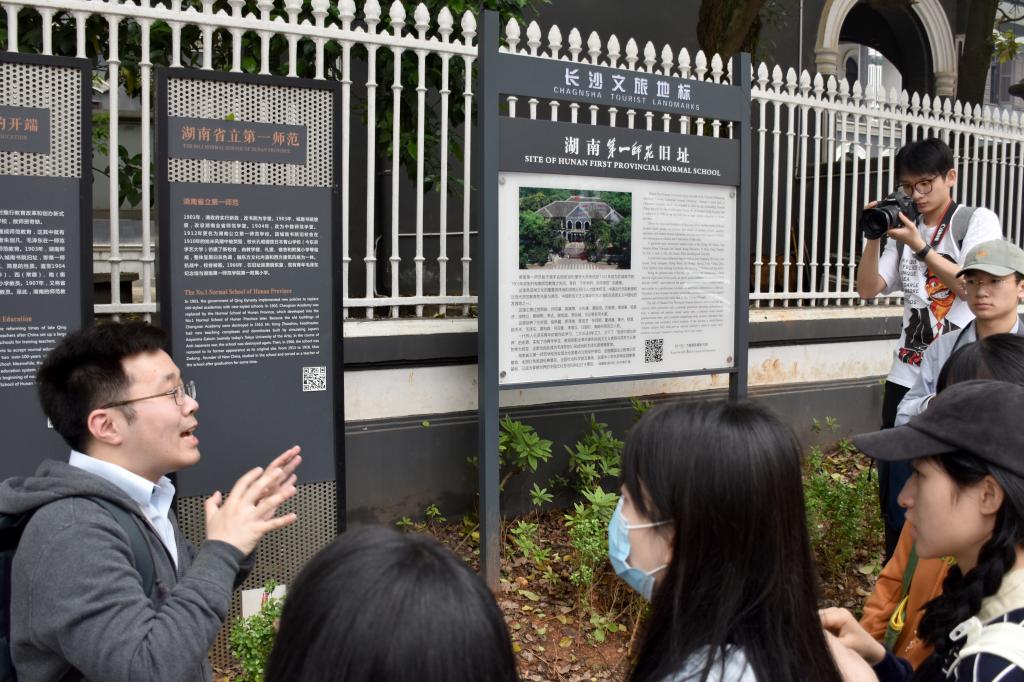 在中共湘区委员会旧址、西园北里历史陈列馆、黄埔军校长沙同学会旧址、革命先辈帅孟奇故居、明德和周南办学点等地,杨静茹、陈沙君、徐志、安沛沛、王欢、曹安琪等同学分别作背景介绍并分享感悟。大家结合习近平总书记在考察湖南期间对青年学子的寄语展开讨论,表示要坚定信念、志存高远,实事求是、脚踏实地,砥砺品行、涵养境界,不负青春、不懈奋斗,传承好千年文脉和红色基因,努力为民族复兴和国家富强作出贡献。