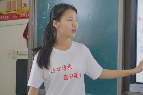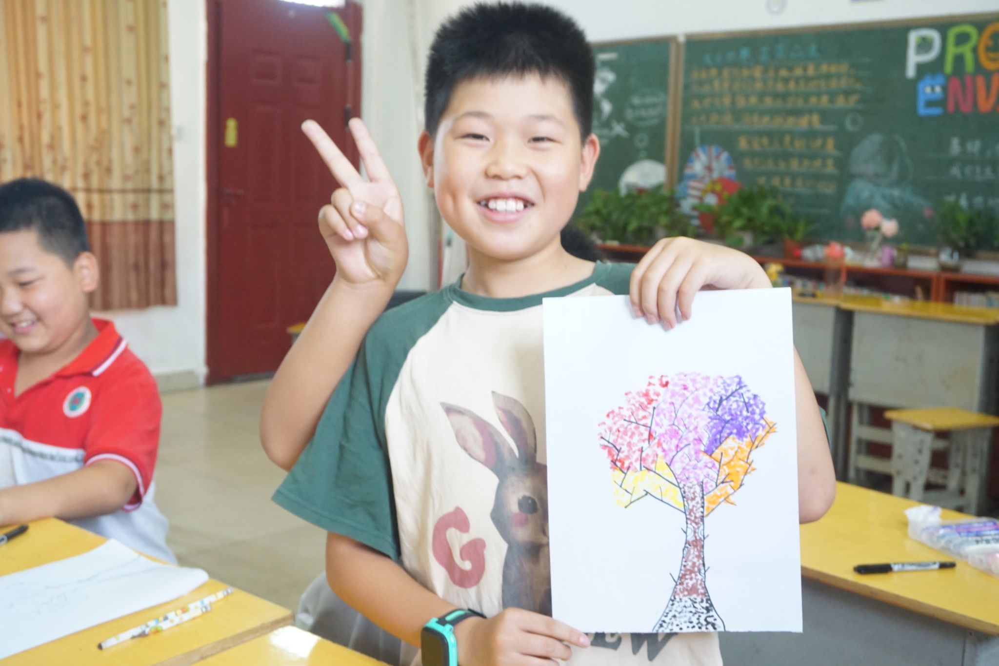 理论知识讲解完毕,学生开始尝试结合所学进行自主创作。画作中融入了学生们个性化的想法与创意,饱含童真与幻想。樊璐华走下讲台逐个为学生提供修改意见,指导作品的完善。部分学生完成作品后露出了明媚的笑容,他们表示创作过程很愉悦。实践团成员袁姝睿用相机记录下了他们的画作。