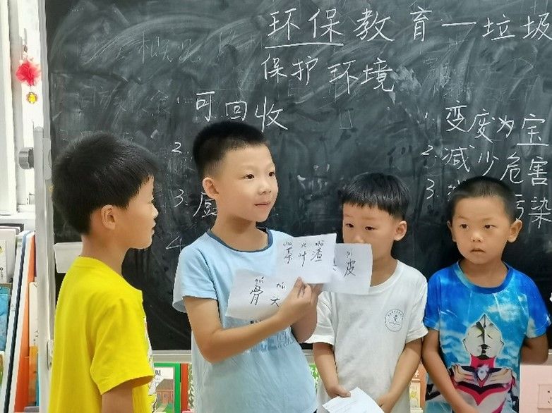 课堂伊始,实践团成员提出“什么是环保”、“环保的作用有哪些”等问题引导学生意识到保护环境就是保护人类自身。随后,实践团成员结合日常生活,向小朋友们详细地介绍了有害垃圾、厨余垃圾、可回收垃圾和其他垃圾等四类垃圾的分类标志和辨别方式。同时,实践团成员联系生活实际,通过举例提问的方式,检验同学们的学习成果,进一步加深他们对垃圾分类的理解。一问一答的教学方式不仅提高了学生的课堂参与度,也让他们对垃圾分类有了更深刻的印象。课堂尾声,实践团成员给学生分发了写有不同种类的垃圾的卡片,组织他们分组讨论正确的垃圾分类方式并上台分享,将所学的知识运用到实践中。
