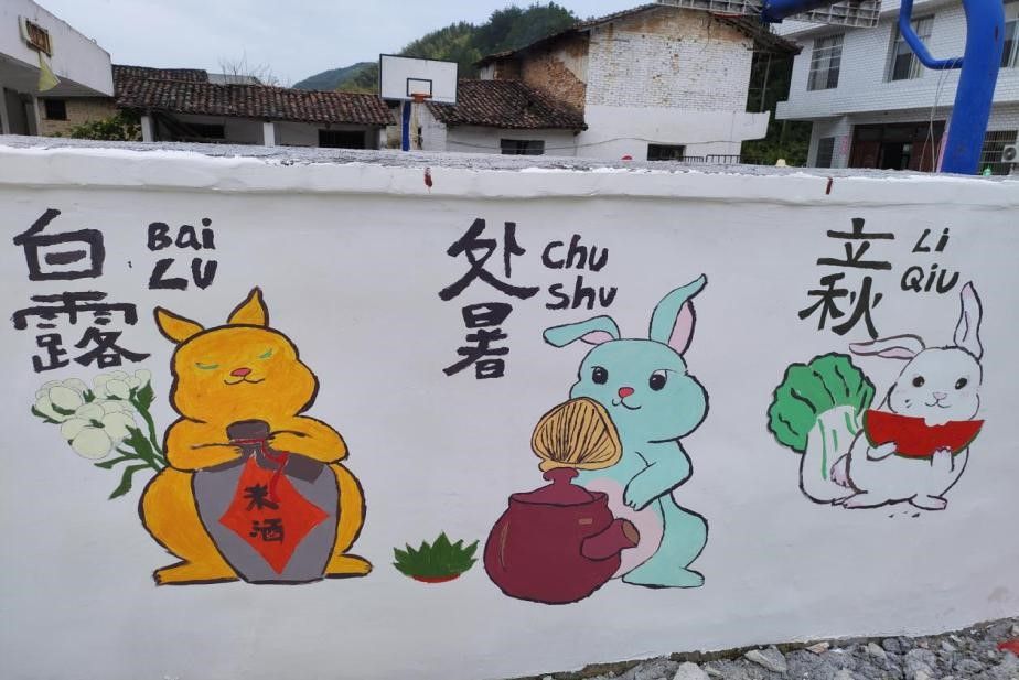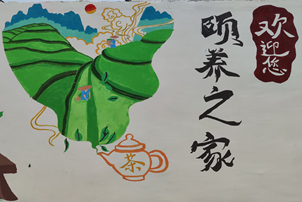 为创作出更好的作品,实践团与当地党委政府积极进行交流讨论,同时对温泉村特色茶产业及颐养之家面向人群等进行了详实的调研,确定并构思了以乡村美景为主题,以茶文化展示、二十四节气文化科普、乡风文明等多方面为内容的多幅画作。绘画现场,实践团成员不畏酷暑、不惧黑暗,用生动可爱的艺术字体配以色彩亮丽的特色图案,让原本单调的墙面有了新时代的进步感与浓浓的文化氛围,使文化墙成为了乡村美景的“代言人”和乡村振兴文化强的“传播者”。墙绘成品也受到村民们的一致夸赞,村民表示墙绘不但看起来赏心悦目,而且能很好地帮助村民了解乡村文明新风,从而将优秀精神文明内化于心,外化于行。