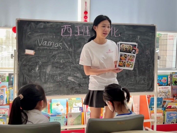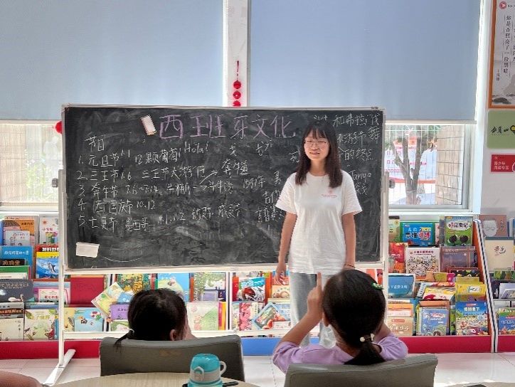 实践团成员依次介绍了西班牙的斗牛、饮食、节日习俗和著名艺术,向小朋友们展示出丰富多彩的西班牙文化。蔡杰以小朋友们熟悉的西班牙斗牛作为切入点,激发小朋友们的学习兴趣,详细介绍了西班牙斗牛的历史起源和主要流程。借助图片,她展示了海鲜饭、塔帕斯等西班牙经典美食,并介绍了西班牙人特别的用餐时间。李莹按照时间顺序,介绍了三王节、奔牛节等著名的西班牙传统节日,并讲述了每个节日的历史起源和传统习俗。在介绍西班牙艺术文化的过程中,她通过播放视频和音乐,引导小朋友们猜测乐器、思考歌唱特点、总结舞蹈风格,充分调动视觉和听觉,向小朋友们展示了西班牙著名艺术弗拉门戈的独特魅力。课程结束之际,实践团成员带领小朋友们学习了“你好”、“再见”等简单的西班牙语日常表达。