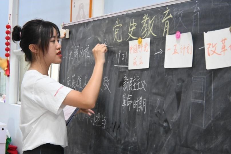 实践团成员选取丰富多样的课堂形式开展活动。在小班教学过程中,实践团成员将课堂分为党的光辉历程、向英雄人物致敬和新时代少年的担当三部分,按照时间顺序梳理中国共产党的发展历程,并讲述半条棉被、红军借据等党史故事,让同学们在故事中感悟党的伟大精神。在向英雄人物致敬环节,实践团成员鼓励小朋友们发挥自己的想象力,在纸上画出自己心目中的英雄并说出自己心中的想法。最后,实践团成员带领小朋友们积极思考“作为新时代少年,我们应有何作为”这一问题,鼓励他们积极参与讨论,明确人生方向。