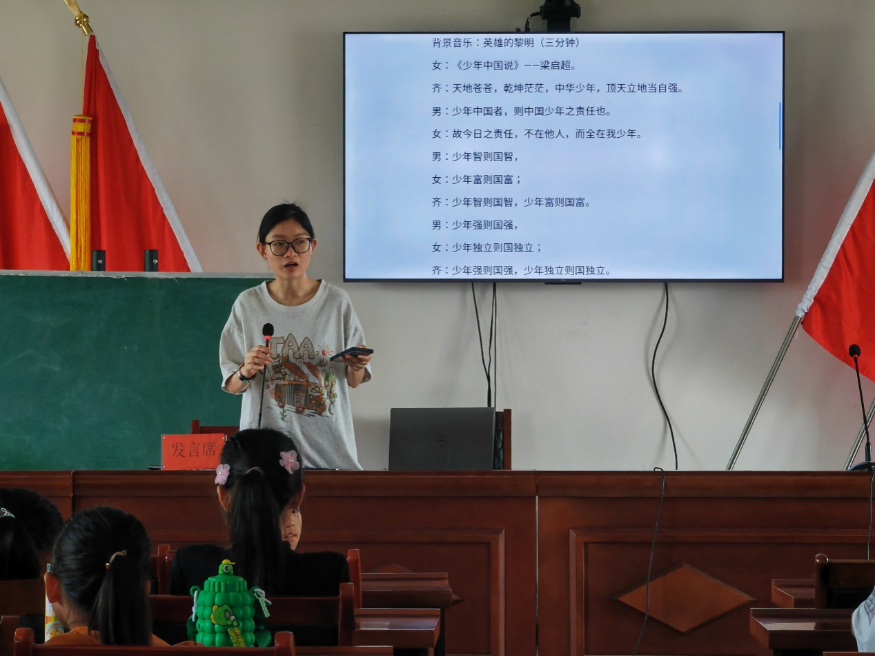 (通讯员 陈馨 杨梅清)7月13日上午,太阳成官网赴张家界市永定区阳湖坪街道办事处的暑期社会实践团与同学们共同开展了一场主题为《少年中国说》的国学经典诵读活动。此次活动旨在弘扬中华优秀传统文化,激发同学们的爱国情怀,助力乡村文化振兴。