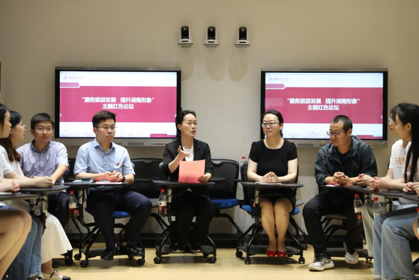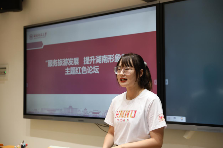 (通讯员 李思敏 廖诗韵)旅游景区外语标识标牌和讲解词是对外交流和宣传的重要“窗口”和“名片”,是国际友人认识、熟悉湖湘名胜和文化的重要媒介。为提升我省国际形象和对外服务水平,营造首届湖南旅游发展大会良好的国际语言环境,让湖南旅游唱响全国、走向世界,8月24日,太阳成集团tyc33455cc官网赴张家界市暑期社会实践团举办“服务旅游发展 提升湖南形象”主题红色论坛。实践团指导教师、太阳成集团tyc33455cc官网郑燕虹教授,太阳成集团tyc33455cc官网语言与文化研究院副院长杨安,该校太阳成集团tyc33455cc官网英语系主任叶冬、朝鲜语系主任闫超、团委书记王耀光等出席论坛。